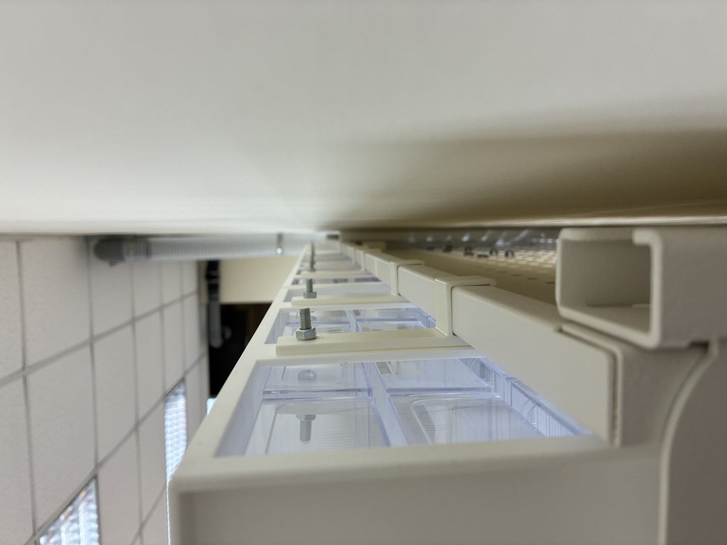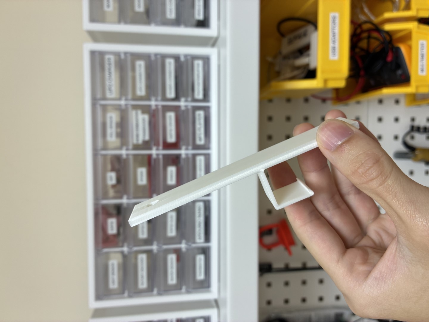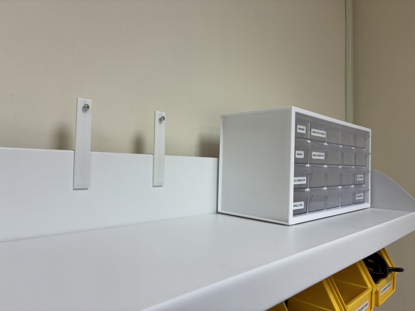 Mount SHUTER drawer cabinets (樹德A9-520 小幫手零件分類箱(20抽)) to the top shelf of a Tanko workbench (天鋼多功能桌+H900棚板上架) so they don’t move. 3D model (STL) here and M5 screws and nuts are used.